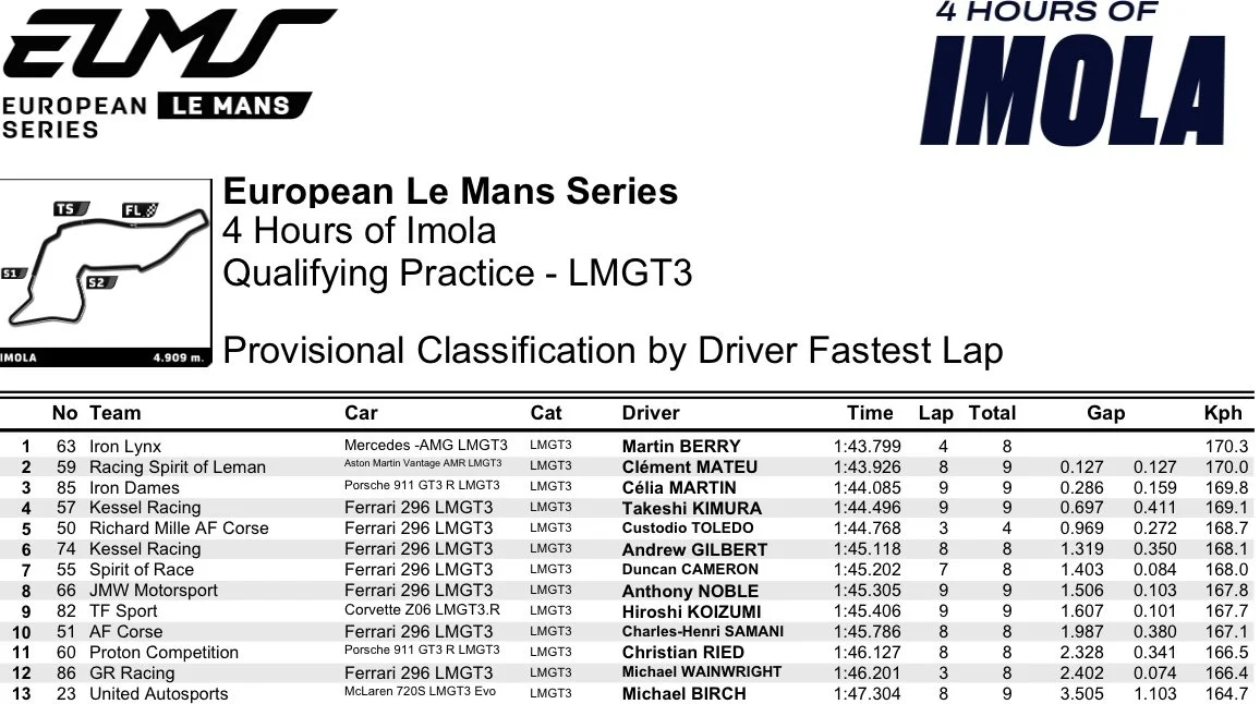 Martin Berry puts the #63 Iron Lynx Mercedes-AMG LMGT3 on class pole with a 1:43.799 ahead of Clement Mateu with the #59 Racing Spirit of Leman Aston Martin second with a 1:43.926 and Celia Martin with a 1:44.085 in the #85 Iron Dames Porsche.