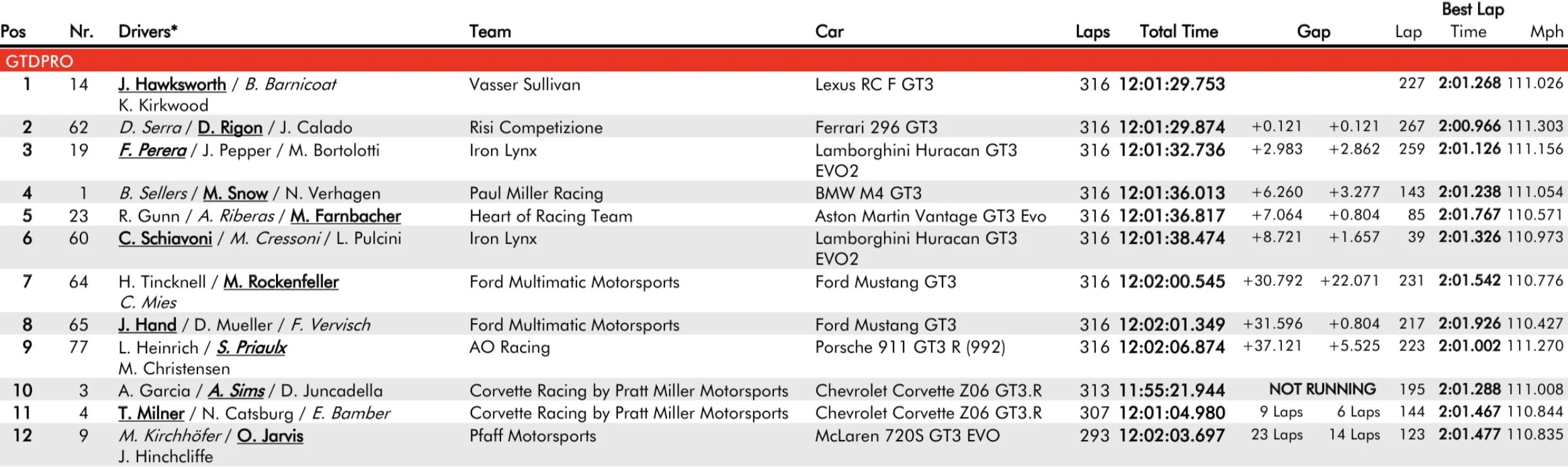 After « fully dive-bombing » Juncadella’s #3 Corvette who was second behind Serra’s #62 Ferrari, Hawksworth (#14 Vasser Sullivan Lexus RC F GT3) past Serra in the #62 Risi Competizione Ferrari 296 GT3 with a daring move into Turn 1. The pass worked, and Hawksworth held Serra the remaining 20 minutes.