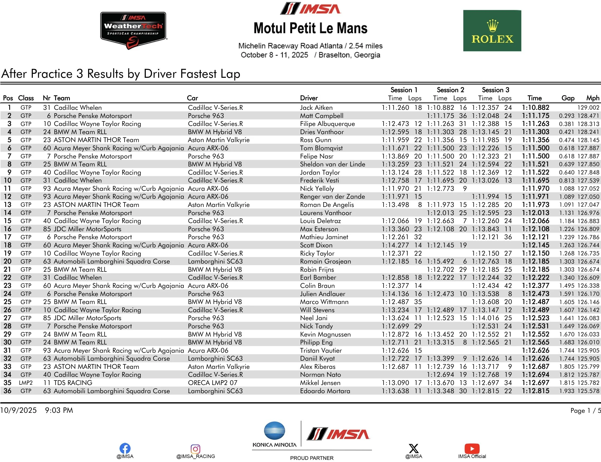 Jack Aitken was the fastest of the day driving #31 Cadillac Whelen Cadillac V-Series.R with a 1:10.882 set during FP2, the afternoon session. He was the only driver under the 1:11.000 mark. Felipe Albuquerque was third fastest on board of #10 Cadillac Wayne Taylor Racing Cadillac V-Series. R with a 1:11.175; Jordan Taylor in #40 Cadillac was 9th with a 1:11.970.