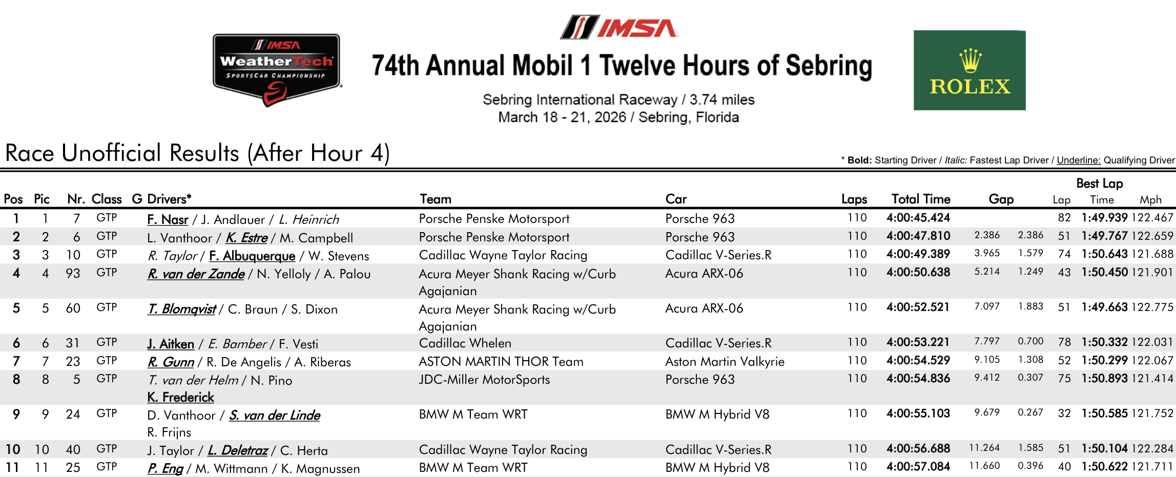 Julien Andlauer in #7 Porsche leads Matt Campbell in sister #6 and Will Stevens in Cadillac #10 at the four hours mark. Both Acura follow in P4 and P5. Porsche Penske Motorsport Porsche #7 team scores maximum points in IMEC championship at four hours mark.