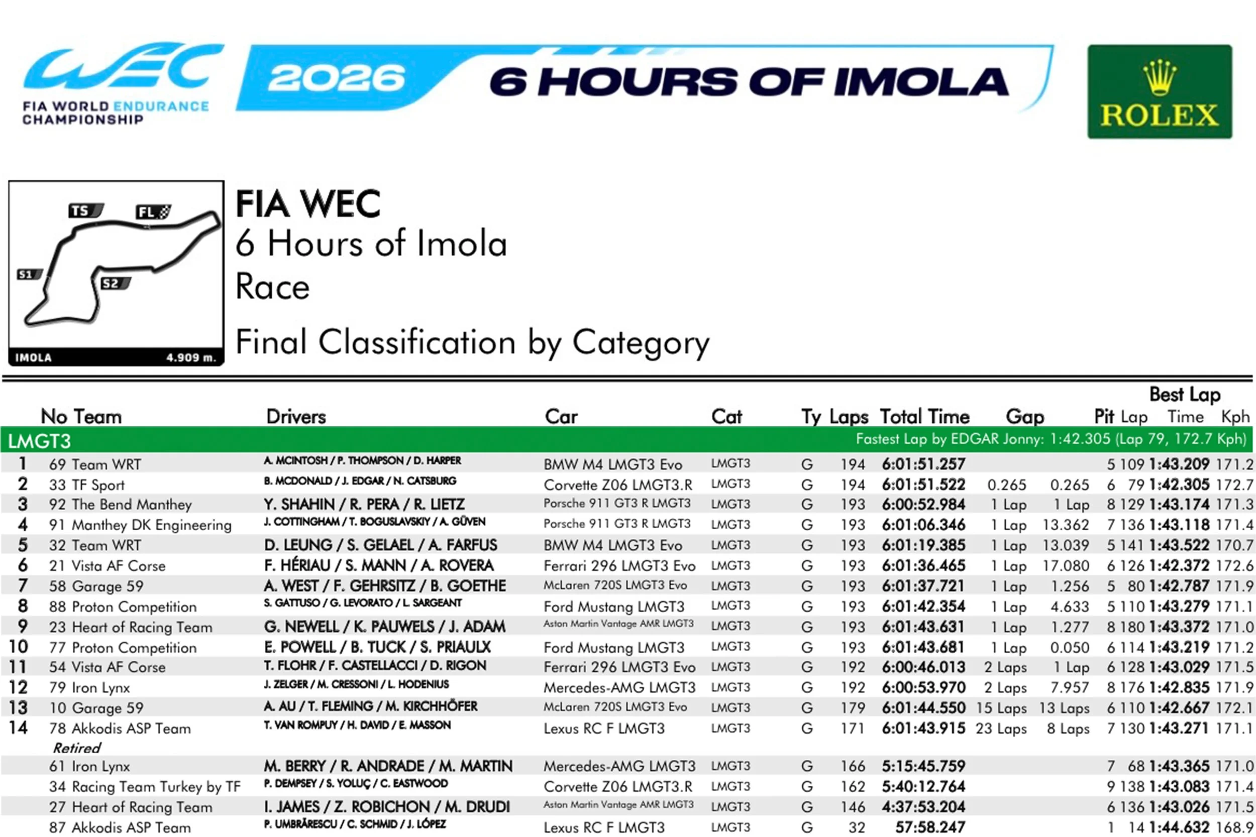 6 Hours of Imola LMGT3 final classification